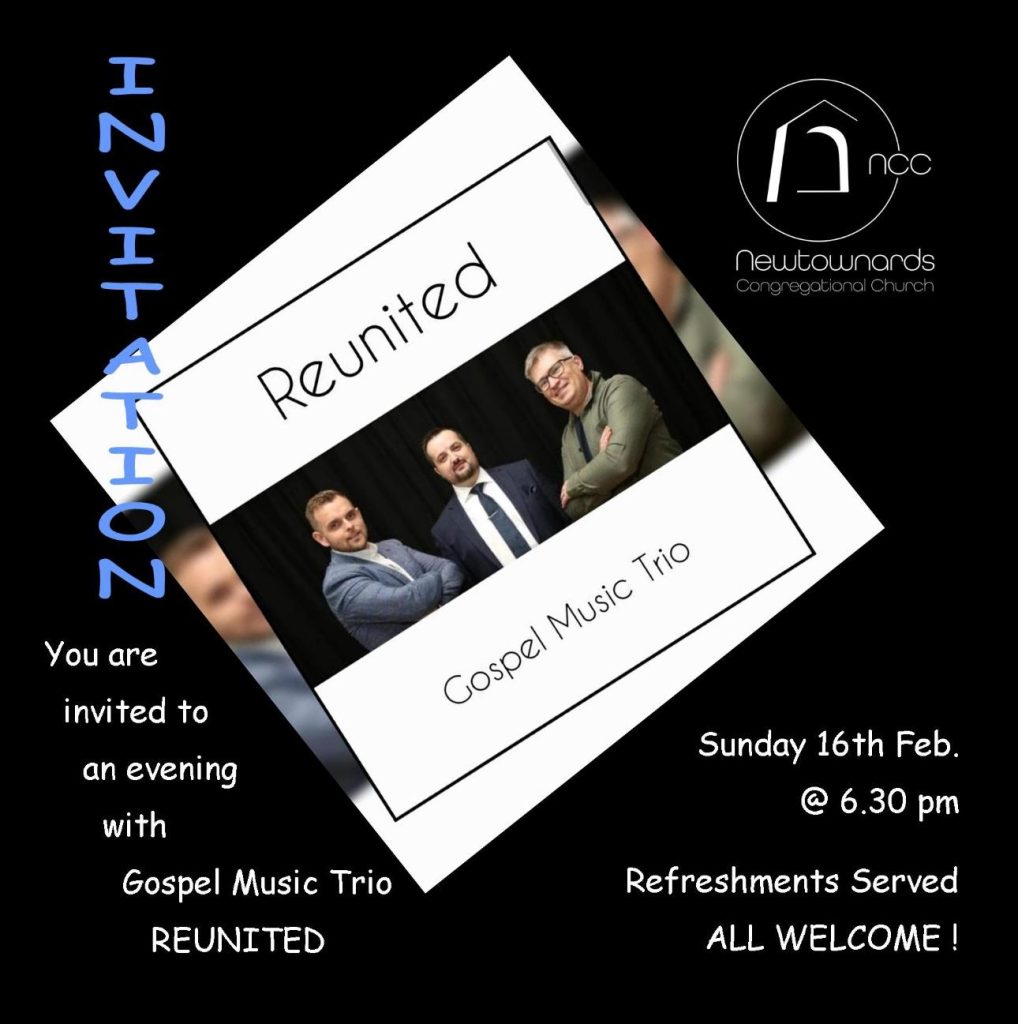 We invite you all to come along and hear the amazing Gospel Music Trio REUNITED tomorrow night. Spread the word and bring your family and friends along where refreshments will be served afterwards!